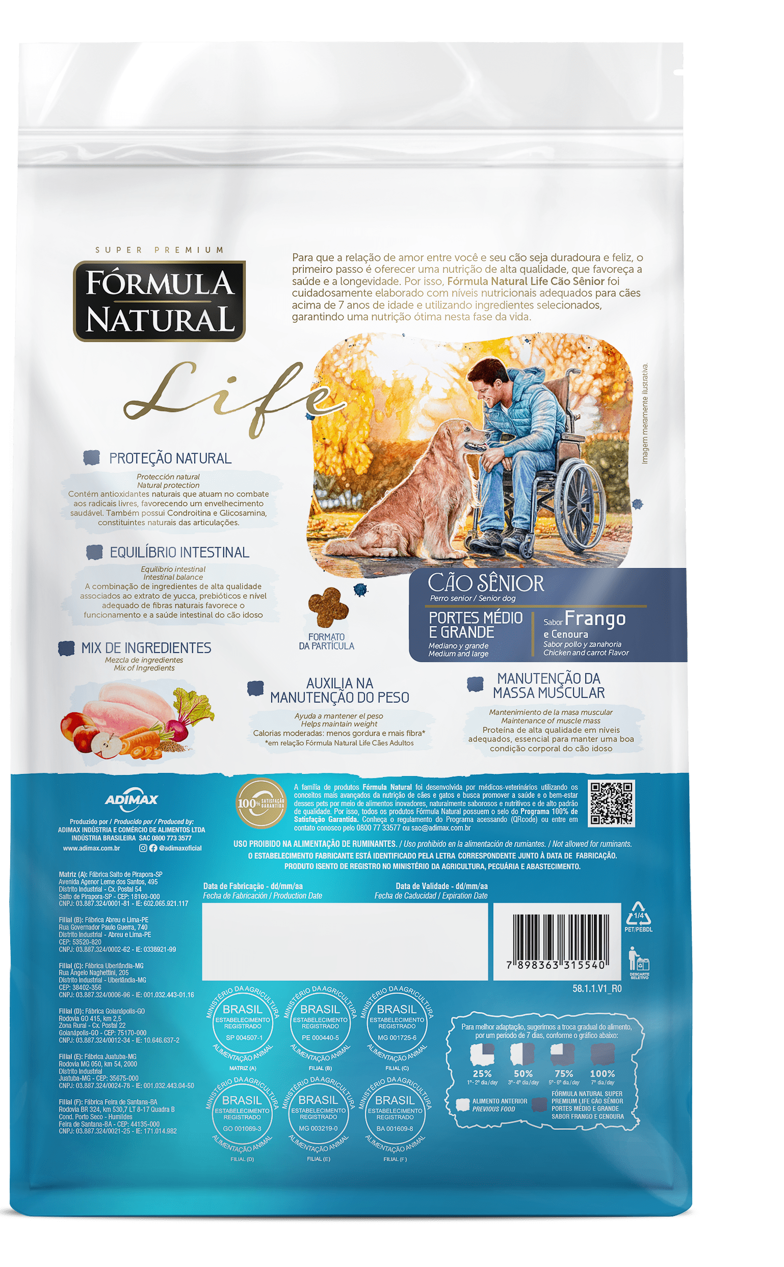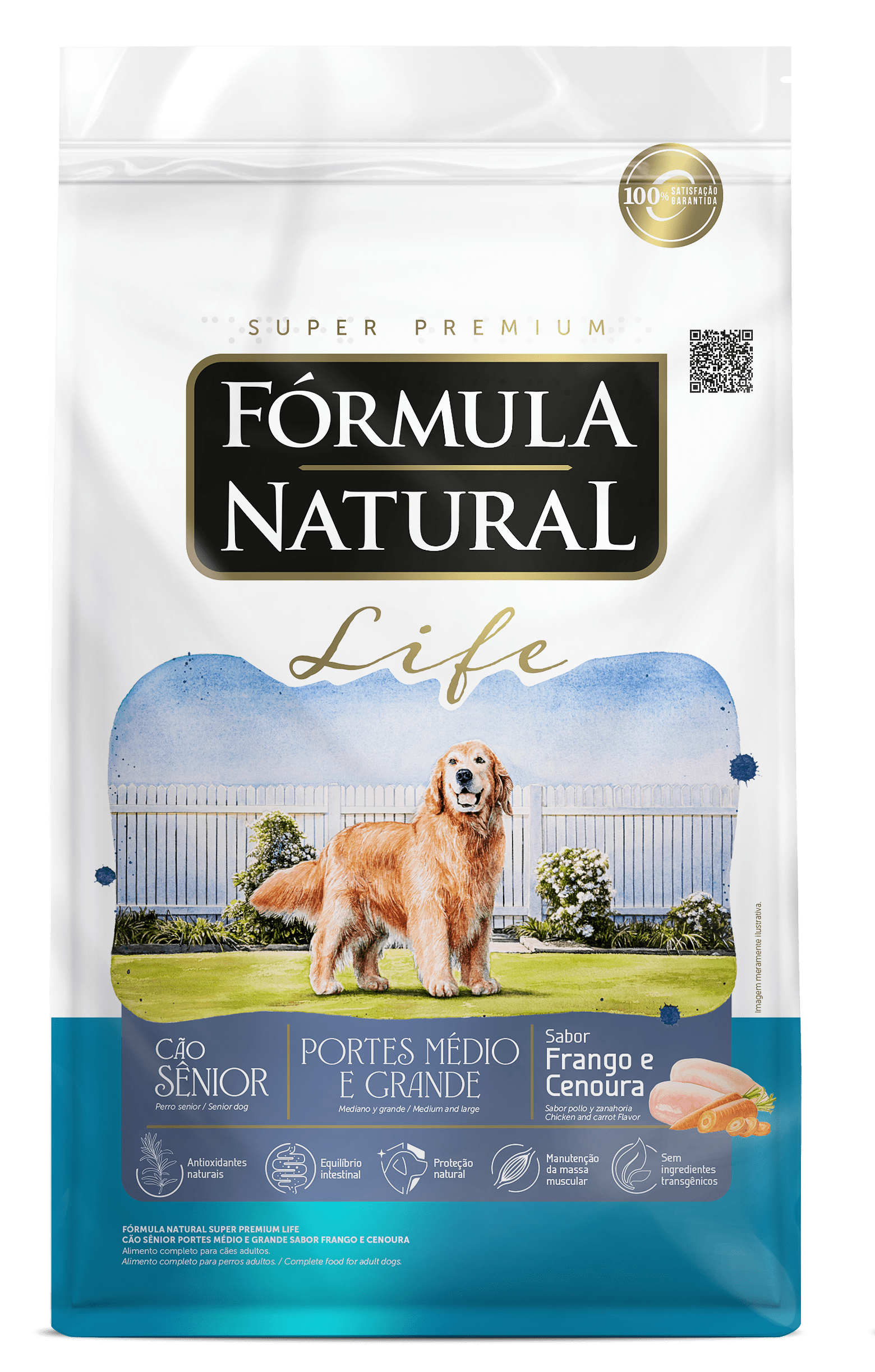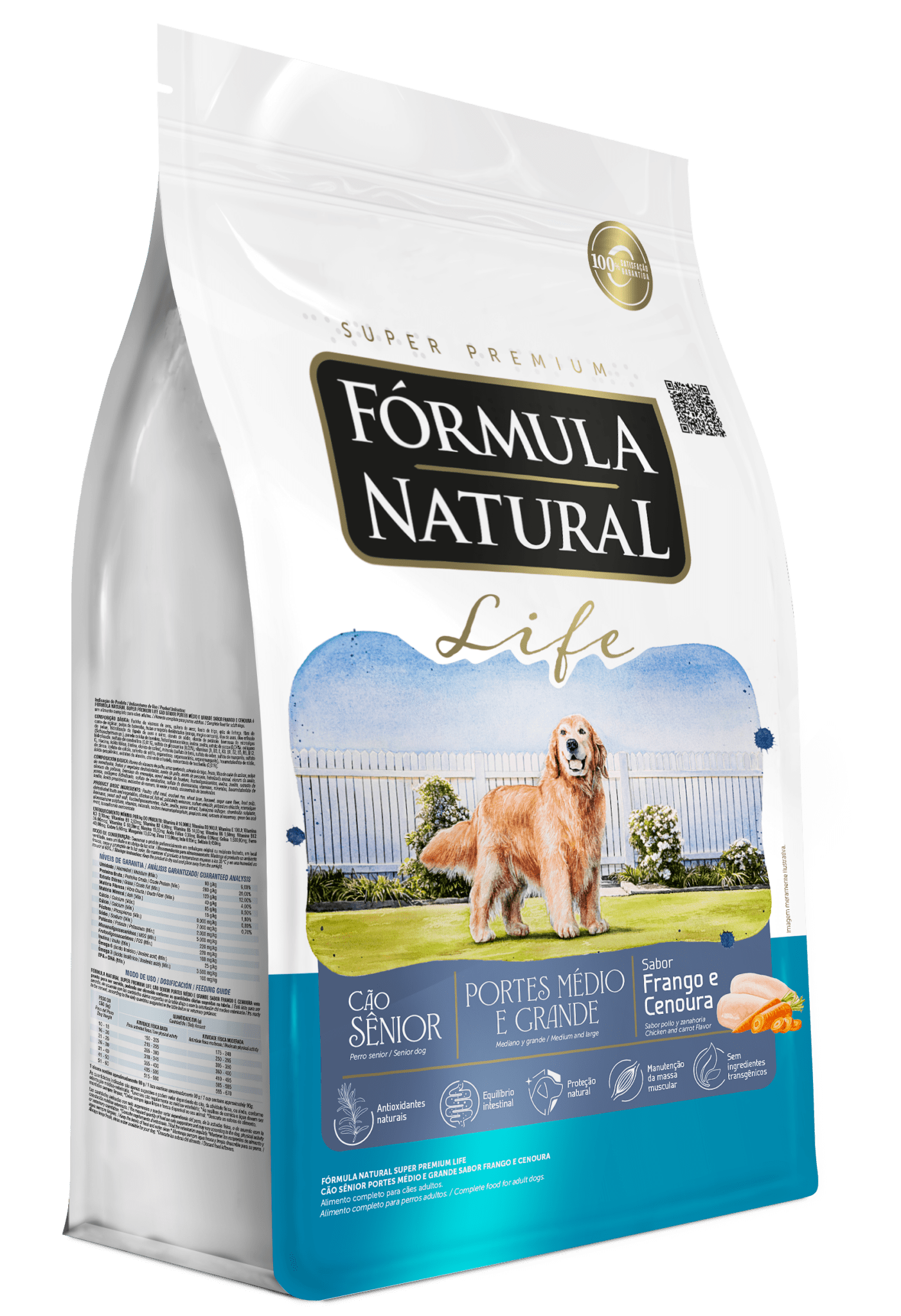 Farinha de vísceras de aves, quirera de arroz, farelo de trigo, grão de linhaça, fibra de cana-de-açúcar, polpa de beterraba, frutas e vegetais desidratados (manga, maçã e cenoura), óleo de aves, óleo refinado de peixe, hidrolisado de fígado de aves e suíno, cloreto de sódio, cloreto de potássio, biomassa de microalgas (Schizochytrium sp.), parede celular de levedura, frutooligossacarídeos, inulina, zeolita, extrato de yucca (0,04%), colágeno hidrolisado, sulfato de condroitina (0,01%), sulfato de glicosamina (0,03%), vitaminas (A, D3, E, K3, B1, B2, B5, B6, B12, C, niacina, ácido fólico, biotina, cloreto de colina), minerais (sulfato de ferro, sulfato de cobre, sulfato de manganês, sulfato de zinco, iodato de cálcio, selenito de sódio, organozinco, organosselênio, organomanganês), hexametafosfato de sódio, ácido propiônico, extratos de alecrim, chá verde e hortelã, concentrado de tocoferóis (0,01%).