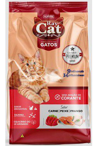 Farinha de vísceras de frango, farinha de peixe, farelo de soja*, farelo de arroz, milho integral*, gordura de frango, hidrolisado proteico de frango e suíno, cloreto de sódio (sal comum), taurina, DL-metionina, cloreto de colina, premix vitamínico mineral (vitamina A, vitamina D3, vitamina E, vitamina K3, vitamina B1, vitamina B2, vitamina B6, vitamina B12, pantotenato de cálcio, niacina, ácido fólico, cloreto de colina, biotina, sulfato de cobre, sulfato de ferro, sulfato de manganês, iodato de cálcio, selenito de sódio, sulfato de zinco, taurina e bióxido de silício), ácido fosfórico, corantes (amarelo tartrazina, azul brilhante, caramelo natural e vermelho ponceau) e antioxidantes (BHA e BHT)