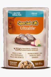 Carne de peixes, carne de frango, cabeça de frango, dorso de aves, fígado de suíno, rim de suíno, plasma sanguíneo desidratado de suíno, gelatina, farinha de batata doce, fibra de mandioca, farinha de trigo, amido modificado de milho, dextrose, proteína isolada de soja, proteína texturizada de soja, óleo de aves, biomassa de microalgas desidratada (Schizochytrium sp.), celulose, levedura de cana-de-açúcar hidrolisada e desidratada, extrato de Yucca schidigera, subproduto da extração da L-cistina, cloreto de sódio, carbonato de cálcio, cloreto de potássio, água, glicina, cloridrato de L-cisteína monohidratado, DL-metionina, taurina vitamina D3, vitamina E, vitamina K3, vitamina B1, vitamina B2, vitamina B6, vitamina B12, vitamina C, niacina, cloreto de colina, ácido pantotênico, ácido fólico, biotina, iodato de cálcio, cobre aminoácido quelato, ferro aminoácido quelato, manganês aminoácido quelato, zinco aminoácido quelato, goma guar, carragena, tripolifosfato de sódio, caramelo I.