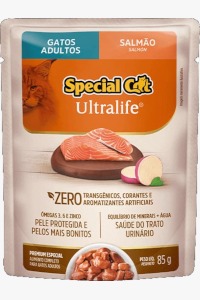 Farinha de salmão, carne mecanicamente separada de aves, cabeça de frango, dorso de aves, fígado de suíno, plasma sanguíneo desidratado de suíno, gelatina, farinha de batata doce, fibra de mandioca, farinha de trigo, amido modificado de milho, dextrose, proteína isolada de soja, proteína texturizada de soja, óleo de aves, biomassa de microalgas desidratada (Schizochytrium sp.), celulose, levedura de cana-de-açúcar hidrolisada e desidratada, extrato de Yucca schidigera, subproduto da extração da L-cistina, cloreto de sódio, carbonato de cálcio, cloreto de potássio, água, glicina, cloridrato de L-cisteína monohidratado, DL-metionina, L-carnitina, taurina, vitamina D3, vitamina E, vitamina K3, vitamina B1, vitamina B2, vitamina B6, vitamina B12, vitamina C, niacina, cloreto de colina, ácido pantotênico, ácido fólico, biotina, iodato de cálcio, cobre aminoácido quelato, ferro aminoácido quelato, manganês aminoácido quelato, zinco aminoácido quelato, goma guar, tripolifosfato de sódio, extrato de urucum, cúrcuma (Cúrcuma longa).