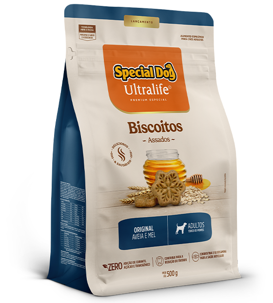 Farinha de batata doce, farinha de trigo, aveia (5,4%), mel de abelha (0,5%), ovo em pó, farinha de torresmo, farinha de vísceras de aves, concentrado proteico de soro de leite (whey protein), colágeno, óleo de aves, prebiótico (parede celular de levedura mín. 0,2%), bicarbonato de sódio, subproduto da extração da L-cistina, sulfato de condroitina (0,03%), sulfato de glicosamina (0,05%), hexametafosfato de sódio (0,05%), cloreto de sódio, ácido propiônico, sorbato de potássio, antioxidantes naturais: concentrado de tocoferóis, extrato de alecrim, extrato de chá verde (Camellia sinenses) e extrato de menta, hortelã (Mentha spp.).